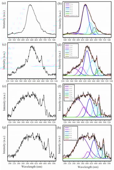 The photoluminescence (PL) properties of the synthesized β-Ga2O3 nanostructures were studied. Broad PL emission in the UV-blue spectral region was observed in the samples grown at temperatures ≥900 °C and 32 min. No PL signals were observed from samples prepared at 800 and 850 °C since there were no β-Ga2O3 nanostructures formed at the two lower temperatures. Figure 7 shows the representative PL spectra in the spectral range of 290–550 nm obtained for the β-Ga2O3 nanostructures prepared at 1000 °C and 32 min at different excitation wavelengths. The PL spectrum at an excitation wavelength (λex) of 310 nm (Figure 7a) showed a broad peak centered around 433 nm. In order to have a clear understanding about the observed luminescence, the PL spectrum was deconvoluted. The deconvolution of this PL spectrum, illustrated in Figure 7b, showed six emission bands with each Gaussian curve centered at 376, 404, 432, 455, 473, and 489 nm, of which the UV (376 nm) and deep blue (404 nm) bands are broad and very weak. To better understand the observed PL spectra in these β-Ga2O3 nanostructures, the sample was excited with different excitation wavelengths (λex) varied from 310 to 260 nm, with those at 300 nm, 290 nm, and 270 nm shown in Figure 7c,e,g, respectively. The corresponding deconvoluted spectra are illustrated in Figure 7d,f,h, respectively. The PL spectrum at λex = 300 nm had similar emission peaks at 374, 404, 430, 456, 474, and 486 nm. With the reduction in λex to 290 and 270 nm, the five blue emission bands (404–490 nm) and the UV emission were consistently present, but the UV emission peak became quite dominant at the two shorter λex of 290 and 270 nm.