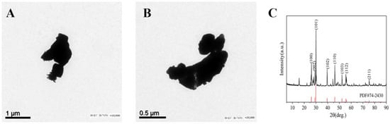 TEM images of La2O3 NPs ((A) 10,000× and (B) 20,000×), and XRD pattern (C). The black curve represents the La2O3 NPs sample, and the red curve represents the standard.