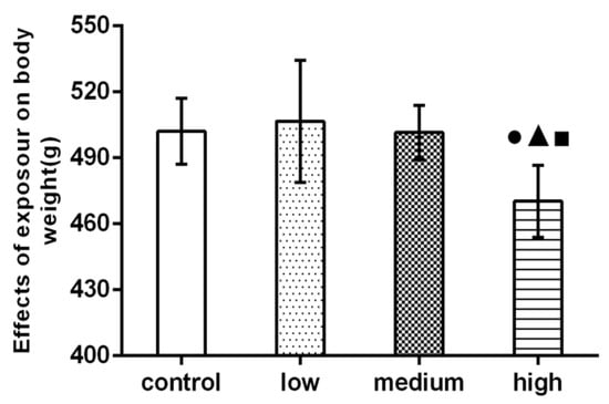 The rats in the control group had shiny fur, quick movement, a sensitive reaction, and good drinking-water intake. The weight of the rats is shown in Figure 2. In the high-dose group, the hair was dry, yellow, and dull, and there was a depilation phenomenon. Autonomous activities were generally reduced, the reaction was slow, and the food intake and water intake were reduced.