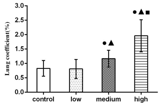 Figure 3 showed that lung coefficients of rats in the medium-dose and high-dose groups were significantly higher than those in the control group (p < 0.05).