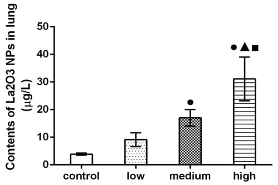 Contents of La2O3 NPs in lung of rats. Note: ●, compared with the control group, p < 0.05; ▲, compared with the low group, p < 0.05; ■, compared with the medium group, p < 0.05.