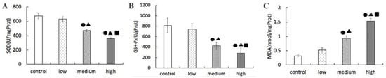 Effects of La2O3 NPs on SOD, GSH-Px activity, and MDA content in lung tissue of rats in each group. (A) SOD level. (B) GSH-Px level. (C) MDA activity. Note: ●, compared with the control group, p < 0.05; ▲, compared with the low group, p < 0.05; ■, compared with the medium group, p < 0.05.