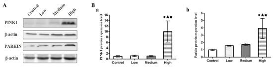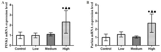 As shown in Figure 6, the qRT-PCR results showed that PINK1 and Parkin mRNA expression levels increased significantly in the high-dose group relative to the control group (p < 0.05).