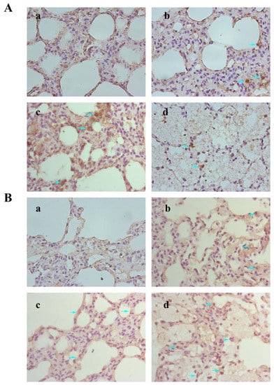 Expressions of Bax (A) and Bcl-2 (B) in rat lung were detected by immunohistochemical staining. These images were taken at 400× magnification for the control group (a), low-dose group (b), medium-dose group, (c) and high-dose group (d). Arrows indicated the positive cells.