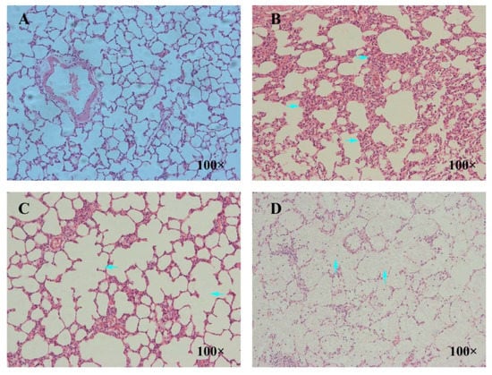 Effect of La2O3 NPs on pathological morphology of lung tissue in rats. These images were taken at 100× magnification for the control group (A), low-dose group (B), medium-dose group, (C) and high-dose group (D). By contrast, the alveolar septum in the control group was thickened (right arrows in (B)), and alveolar fusion occurred in the medium-dose group (left arrows in (C)). The alveolar cavity in the high-dose group was filled with collagen fibers, fibroblasts, and lymphocytes (up arrows in (D)).