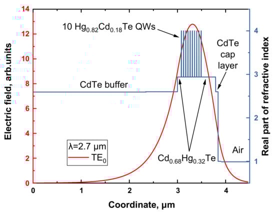 - Fadeev, M.A.; Rumyantsev, V.V.; Kadykov, A.M.; Dubinov, A.A.; Antonov, A.V.; Kudryavtsev, K.E.; Dvoretskii, S.A.; Mikhailov, N.N.; Gavrilenko, V.I.; Morozov, S.V. Stimulated emission in the 2.8–3.5 μm wavelength range from Peltier cooled HgTe/CdHgTe quantum well heterostructures. Opt. Express 2018, 26, 12755–12760. [Google Scholar] [CrossRef]