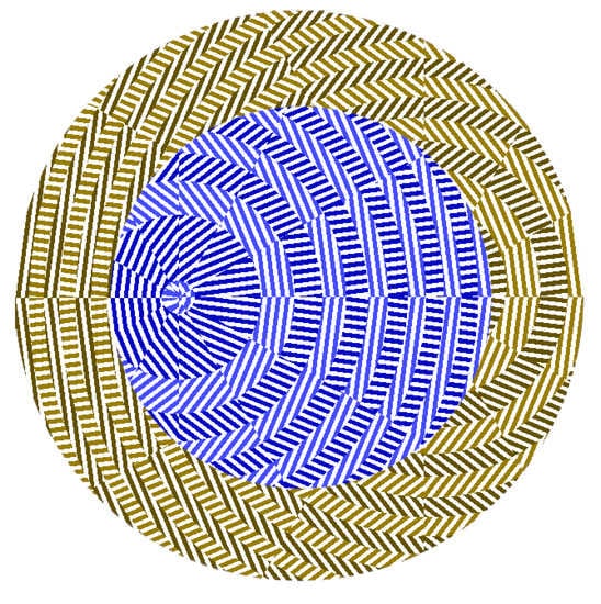Metalens for detecting an LHCP laser beam with TC m = −1 and m = −2: white is a metalens material, colored patterns—through grooves. Blue/cyan colors correspond to the inner metalens intended to focus a beam with TC m = −1 at point (−3 μm; 0), brown/yellow—for the outer one for a beam with m = −2 and a focal point at (3 µm; 0). In the gratings, the darker-colored zones (blue, brown) are rotated by 90 degrees relative to the lighter-colored zones (yellow, cyan) as the corresponding phases in these zones are shifted by π, thus making it possible to focus the incident light. These zones are circular in the inner metalens (cyan/blue areas are round) and spiral in the outer one (brown/yellow). Each zone is divided into 12 sectors, with the direction of gratings in each sector being constant.