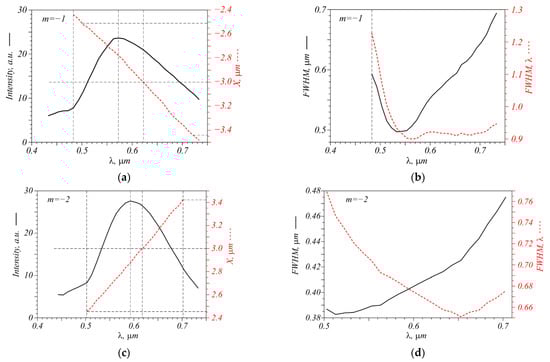 Mode-division multiplexing in a waveguide can be achieved using multiple wavelengths in one fiber. Therefore, it would be interesting to analyze how the metalens works with different wavelengths. Shown in Figure 3 are plots of the intensity maximum and its X coordinates depending on the incident wavelength, as well as plots of the full width half maximum (FWHM) of the peak for the incident field with TC m = −1 and m = −2.