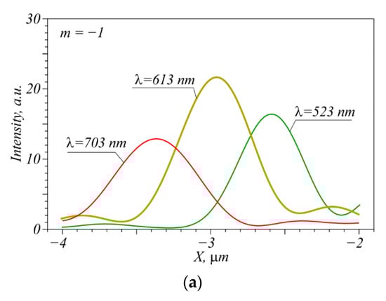 Since the numerical aperture for this TC is higher, the focal spots become narrower, and the peak for m = −2, λ = 703 nm falls on the second ring from the focal spot with λ = 523 nm. Thus, the central peak is greater than for the m = −1. However, if only two extreme wavelengths are used, then the vortex with λ = 523 nm is seen from Figure 5a,b to be resolved with p = 7.7, and the vortex with λ = 703 nm—with p = 4. Even if the vortex with λ = 613 nm is present, the maxima of the two neighboring wavelengths can be distinguished in the beam due to narrower focal spots. If we decrease the incident intensity of the vortex λ = 613 nm to a possible contrast p = 2.1 (dotted line in Figure 5a), then all three wavelengths with TC m = −2 will not interfere with each other.