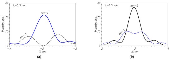 The question is how does the beam with TC m = −1 and any wavelength disturb the detection of individual wavelengths in the beam with TC m = −2? Side lobes of the vortex with TC m = −2 that can interfere with the focal spot of the vortex with TC m = −1 are shown in Figure 6a, the wavelength is 613 nm. Similar results for the focal spot of the vortex with TC m = −2 are shown in Figure 6b. The vortices are seen not to interfere with each other, however, at other wavelengths (523 nm, 703 nm), the peak shift does not allow them to be distinguished with the contrast p = 2 or higher. Therefore, at least two vortices with TC m = −1, m = −2 can be detected simultaneously on one wavelength, whereas for other wavelengths perhaps, time division multiplexing is necessary.