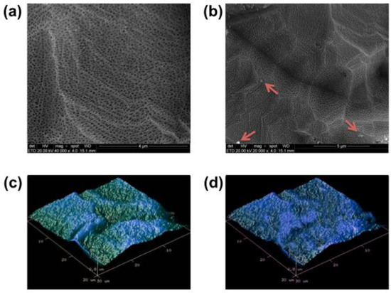 Superficial morphology acquired by SEM and by AFM of nanotubular surfaces before ((a)—SEM, scale bar—4 μm and (c)—AFM) and after ((b)—SEM, scale bar—5 μm and (d)—AFM) saliva interaction for 10 min. Small impurities (red arrows) can be observed after saliva exposition (c); however, no significant morphological alteration on the nanotubular surface could be detected.