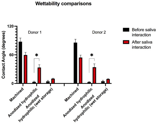 Wettability analysis before and after saliva interaction of two saliva donors. * Asterisks indicate statistical significance (p < 0.05) after saliva interaction for 10 min among the tested surface groups.