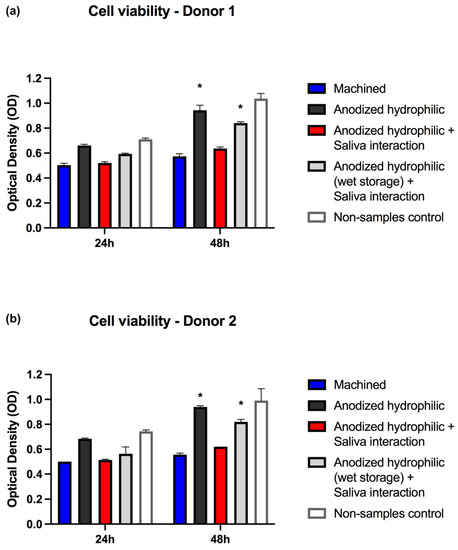 Cell viabilities analysis for the different groups of surface treatments and storage protocols, including two different analyses with two saliva samples (a,b). * Asterisks signaling significance (p < 0.05) when compared to machined surfaces and anodized hydrophilic + saliva interaction surfaces at 48 h.