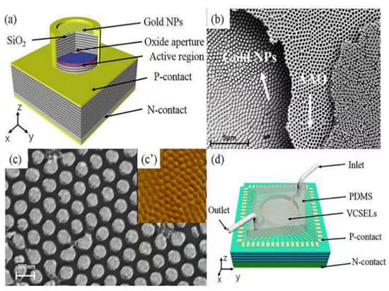This work used a VCSEL with a laser band of 850 nm as the sensing light source. Figure 1a is a three-dimensional schematic diagram of the VCSEL integrated with a gold nanoparticle array, which shows the chip’s main structure and morphology integrated with a hexagonal gold nanoparticle array, taking a single laser as an example.