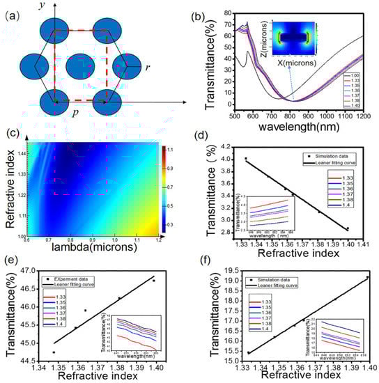 Gold nanoparticle arrays were integrated on quartz glass substrates, and bonded microfluidic channels. Then, the sucrose solution with refractive index (RI) of (1.333–1.3998) was introduced into the microfluidic channel at a steady flow rate of 1 mL/h from low to high, and its transmission spectrum was measured. Air needed to be introduced between sucrose solutions with different refractive indexes to realize the separation of solution samples. The effective volume of the sensing area in the channel was 3 μL. Therefore, the sample usage of this device of about 10 μL was enough. Figure 2e shows the transmission spectrum of the hexagonal gold nanoparticles array relative to RI measured experimentally. The figure shows the fitting curve of transmittance of the gold nanostructures in the 850 nm laser wavelength region; we could clearly observe that transmittance increased approximately linearly with the refractive index of the solution.