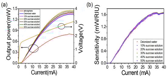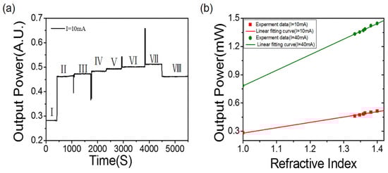 Next, we characterized the performance of the refractive index sensor. It included P-I-V and a real-time power (P)—time (T) curve. According to the P-I-V curve, the threshold current was 2.5 mA, and the differential resistance was 39.4 Ω. Figure 3a shows the P-I-V curve with constant voltage and current and variable refractive solution index. It can be seen that the output light power also changed when different refractive index solutions were introduced. It shows that the sensor was responsive to the change of the background refractive index. Figure 3b shows the change in sensor sensitivity when different refractive index solutions were introduced. Here, we defined the refractive index sensitivity s as the ratio of light intensity change to volume RI change, s = ΔP/Δn. From the test results, when the saturation current was 40 mA, the sensitivity reached the maximum value of 1.65 × 106 nW/RIU, which was an order of magnitude higher than the sensitivity of 1.1 × 105 nW/RIU in Zhao et al.’s article. Therefore, with the optimized gold nanoparticles, the quality of the sensing layer was higher, which improved the overall sensing sensitivity of the device. As shown in Figure 3b, the sensitivity increased accordingly, when the input current increased. In addition, the overlapping curve shows the stability of the sensor. The experimental results show that when the input current was constant, the optical output power of the sensor had a linear relationship with RI.