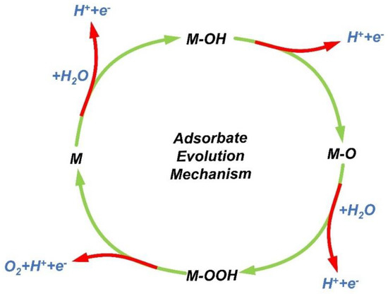 The OER is a multi-state reaction process, and the reaction kinetic is extremely sluggish, requiring a higher potential (1.23 V or higher) for the reaction, significantly reducing the energy conversion efficiency of the entire water decomposition [33,37,38]. Multistep synergistic and non-cooperative proton-electron transfer mechanisms may be used in the precise catalytic stages of OER [29,30]. The OER presents two different categories of catalytic processes: the adsorbate evolution mechanism (AEM) and the lattice-oxygen oxidation mechanism (LOM) [39]. More overpotential is necessary, which increases energy consumption. In addition, the OER is extremely pH sensitive, and the reaction mechanism varies depending on the electrolyte. In an acidic environment, two H2O molecules decompose into four protons (H+) and oxygen (O2). We provide the most well-known OER path below to aid comprehension of the OER process.