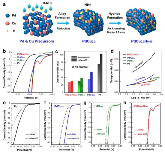 - Jia, Y.; Huang, T.H.; Lin, S.; Guo, L.; Yu, Y.M.; Wang, J.H.; Wang, K.W.; Dai, S. Stable Pd-Cu Hydride Catalyst for Efficient Hydrogen Evolution. Nano. Lett. 2022, 22, 1391–1397. [Google Scholar] [CrossRef]