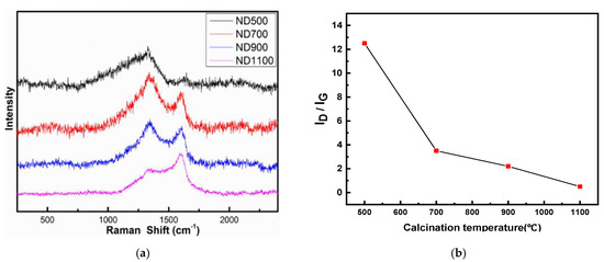 (a) Raman spectra of ND500, ND700, ND900, and ND1100 catalysts. (b) The ID/IG data in the ND catalysts with different calcination temperatures.