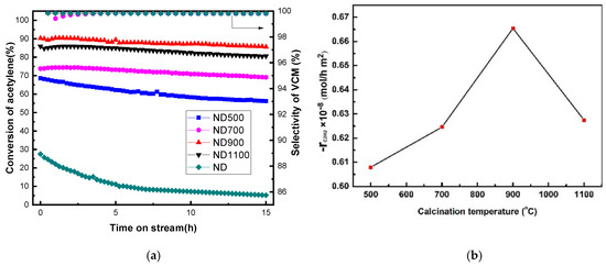 The activity of the catalyst was evaluated by a fixed reactor under the following conditions (reaction temperature = 220 °C, GHSV (C2H2) = 50 h−1, VHCl/VC2H2 = 1.15). Combined with literature reports, ND can obtain nano-carbon catalysts with different structures after different calcination temperatures. When the calcination temperature is lower than 700 °C, sp3-hybridized ultra-dispersed nanodiamonds are formed. When the calcination temperature is 700–800 °C, sp2/sp3 -hybridized bucky nanodiamonds start to form. When the calcination temperature is 900–1100 °C, curved sp2-hybridized onion-like carbons appear [24]. Considering the temperature error range of the tube furnace instrument itself, the calcination temperature was selected as 500 °C, 700 °C, 900 °C, and 1100 °C to achieve the preparation of NDs catalysts with different structures. Figure 4a shows that the initial activities of the ND, ND500, ND700, ND900, and ND1100 can reach 28.2, 68.5, 75.5, 90.6, and 86.5%, respectively. The acetylene selectivity of a series of catalysts is all above 99.5%, and no byproduct materials are generated. The ND catalyst treated with acid alone was almost inactive after 15 h of reaction, indicating that the poor activity of the uncalcined ND catalyst was due to the sp3 hybridization of its own carbon. The ND900 catalyst exhibits the best catalytic activity relative to the other three catalysts. We found that when the calcination temperature was increased, the surface area of the catalyst increased, and when the adsorption amount of the reaction gas increases, and the catalytic activity increases. Therefore, to deduct the influence of the surface area on the activity, we propose the concept of specific activity; that is, the molar amount of acetylene converted per unit area and unit time determines the catalytic activity. Based on the intimal conversion of acetylene and the surface areas of these four catalysts, we calculated the specific activity of NDs according to the following Equation (3) [27]: