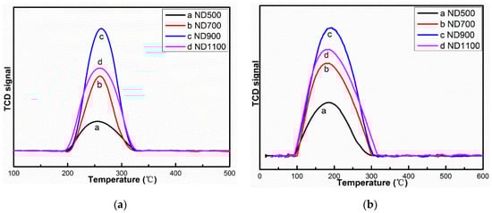 It is well-known that the catalytic activity of the catalyst is related to its surface areas, so the physical structural parameters of the ND catalysts are investigated. As listed in Table 3, the specific surface of the nanocarbon catalyst gradually increases before the reaction with the carbonization temperature increment. The ND1100 expands to 340.5 m2/g, and the pore size and pore volume increase slightly. The increase in the calcination temperature will effectively remove functional groups with the formation of CO and CO2 gases [24]. The formation of CO or CO2 gases may produce micropores or mesopores pores in the calcination process, and this may explain the increased surface areas with calcination temperatures.