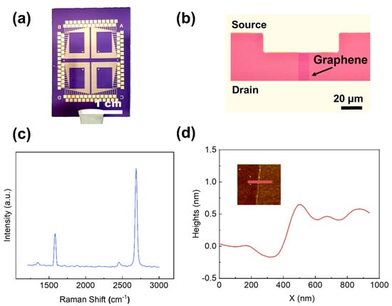 (a) Optical image of as-fabricated GFETs, (b) Optical image of the graphene channel and source/drain electrode. (c) Raman spectrum of a graphene channel after the fabrication process. Two characteristic peaks were found: G peak at ~1580 cm−1 and 2D peak at ~2700 cm−1 (d) The line scan profile of the as-annealed GFET, Inset: AFM image with scan line indicated. The thickness of the graphene channel is ~0.5 nm.