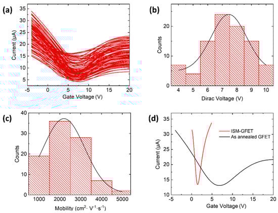 As seen in Figure 2, the current-back gate voltage (I-Vg) measurements show good device-to-device uniformity across the 100 arrays. The Dirac voltage and carrier mobility were extracted by fitting the hole branch of the I-Vg curve to the following equation [36,37]: