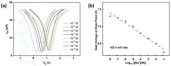 (a) Transport characteristic curves of G-ISFET against different Na+ concentrations from 10−8 to 10−1 M with a bias voltage of 100 mV. (b) G-ISFET response as a function for different target sodium concentrations at the logarithmic scale. A response of 152.4 mV/dec was observed.