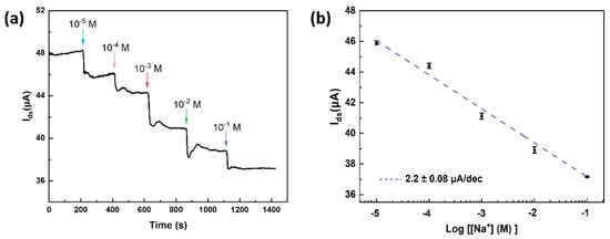 Sodium ions are important indicators for monitoring and evaluating health status owing to their important role in homeostasis and maintaining the proper functions of the nervous system [1,2,3]. For instance, the total sodium level in cognitively normal brain tissues is around 35–45 mM, and 12–21 mM in healthy muscle tissue [4,5,6]. Deviation of sodium concentrations in the human body is related to its hydration status, which can be used as an indicator for health monitoring [7,8]. Thus, rapid, reliable and real-time monitoring of sodium ions has been an increasing interest in the fields of precision medicine and personalized healthcare [1,9,10]. To date, solid-contact ion-selective electrodes (ISE) are the most commonly used platforms for ion sensing, due to their low cost, accuracy, and simple operation [11,12,13,14,15]. However, ISEs have drawbacks, including the relatively high detection limit and narrow detection range, e.g., 10−4 or 10−5 M for specific ions [16,17,18,19].