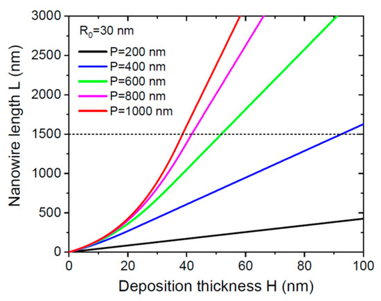 , and , where is the effective deposition thickness at a given deposition rate . Solving Equation (7) with the initial condition , the NW length is obtained in the following form: