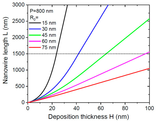 Figure 2 shows the NW length as a function of deposition thickness, obtained from Equations (8), (11), and (12) for the same parameters as in Figure 1 at a fixed pitch of 800 nm and different NW radii from 15 to 75 nm. According to Table 2, the NW growth kinetics is limited by pitch for thicker NWs with 45 nm, 60 nm, and 75 nm radii. Thinner NWs grow much faster, and the conversion from non-linear growth in stage 1 to linear growth in stage 2 occurs at 1500 nm.