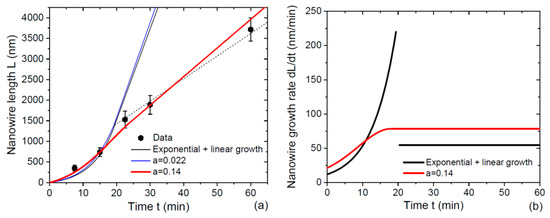 The fit obtained from Equations (8) and (11) at 1.51, 4.3, = 1400 nm, and , corresponding to , , and , is shown by the blue curve in Figure 3a. It is almost indistinguishable from the previous result. The curve fits the datapoints quite well for short NWs in the quasi-exponential growth stage, remains continuous at , but largely overestimates the NW length for longer times. This is not surprising because the small yields an almost exponential growth of short-enough NWs given by Equation (9). The fitting value of 4.3 is almost two-fold lower than 7.89 used for the fit by Equation (23), because the axial growth rate in our model is twice as large due to re-emitted In flow. The transition from exponential to linear growth regime is limited by In desorption from the NW sidewalls because the critical length 3525 nm is larger than .