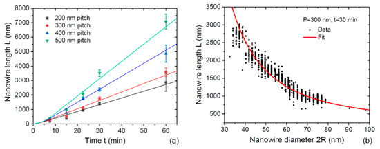 (a) Length of 26–27.5 nm radius InAs NWs versus time for different pitches shown in the legend (symbols) [20], fitted by Equations (8) and (12), with the parameters summarized in Table 3 (lines). (b) Length–diameter correlation of InAs NWs grown for 30 min in 300 nm pitch array (symbols) [20], fitted by the model (line).