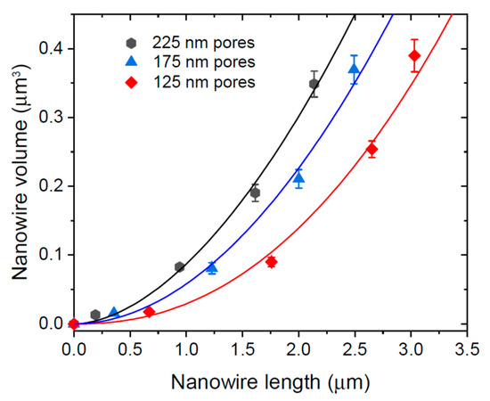 Figure 5 shows the average NW volume versus their average length for three different sizes of pores. This increase is not exponential but can be fitted with the power-law dependence given by Equation (20), with the parameters summarized in Table 4. This power-law behavior is not influenced by pitch according to our analysis. The values of obtained from the best fit for each growth experiment are in the range of ~300–400 nm, while the values of are in the order of 2. Hence, Ga desorption starts from ~800 nm length, while the measured NW lengths extend to 3000 nm. This explains why the power-law works quite well from the very beginning of growth. Conversely, the exponential fit can only be used in the very beginning of growth (for short NWs with lengths shorter than 1000 nm); however, it does not work for longer NWs.