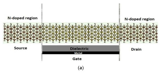 Figure 1 illustrates the sensor configuration, which consisted of three regions, the source, drain, and channel, and the gate electrode placed underneath the channel. The silicon nanowire edges were saturated with hydrogen. The silicon nanowire was oriented in the (100) direction where the two ends of the nanowire were doped to get an n-type doping concentration of 4 × 1019 cm−3 in the source and drain regions.