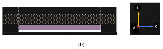 To generate the biosensor electronic transport characteristics, NEGF+SC-EH simulations were performed via the ATK-SE package. To take into consideration the applied bias voltage effect, the SC Hartree potential was used [43] in the conventional EH model. The NEGF+SC-EH model in the ATK-SE package was illustrated in [43]. The Fermi level of the left and right electrodes was generated self-consistently. The grid mesh cut-off energy was 20 Hartree, while 2 × 2 × 50 k-points were selected. The Poisson equation was employed, where the Dirichlet boundary condition was used in the C direction and the Neumann boundary conditions were employed in the A and B directions [60]. A, B, and C are indictors for the A-, B- and C-direction as displayed in Figure 1b.