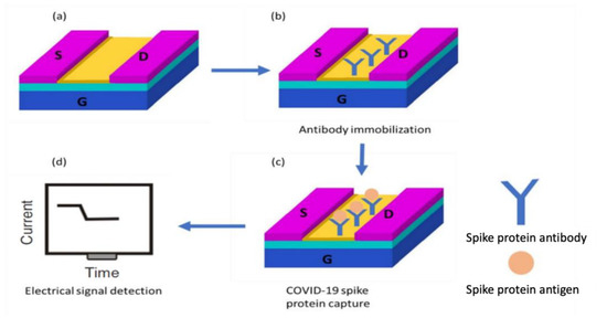 Figure 4a shows the SiNW-FET which consists of three terminals (source, drain, and gate) and a semiconducting channel. The channel connects the source and drain electrodes while the gate modulates the conductance via an applied electrical potential. The sensing element of the SiNW-FET is the channel that alters the current due to the placement of the target molecule. The SiNW-FET has a recognition molecule (spike antibody) attached to the channel surface as displayed in Figure 4b, which specifically detects the target molecule (spike protein) as displayed in Figure 4c leading to variation in the sensor current as displayed in Figure 4d. Before generating the current, it is highly critical to modify the sensor surface to enhance the nanodevice sensitivity. The SiNW-FET channel was modified and coated with the COVID-19 spike protein antibody.