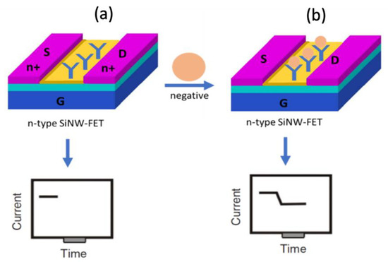 All labeling techniques are considered expensive, cumbersome, and time-consuming [33]. Field-effect transistors have been attracting massive attention because of their label-free detection, real-time response, high sensitivity, and compact size [32,34,35]. Lately, various kinds of silicon-based sensors have been utilized for the various types of detection including viruses, proteins, DNA, and ions [36,37,38,39,40,41]. One of the essential limitations of the mentioned methods is the possibility of false positive results. In biological research, SiNW-FETs are utilized for various types of detection including viruses, cancer biomarkers, small molecules, and DNA sequence. Quick, cheap, and robust analytical methods that are capable of detecting viruses accurately are critical for the enhanced control and prevention of infections.