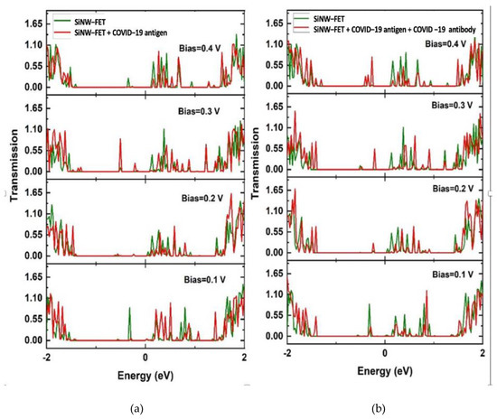 The transmission spectra at different biases are displayed in Figure 6 as a function of the electronic energy for the SiNW-FET with and without the required molecules. The green curves show the SiNW-FET transmission spectra while the red curves show the SiNW-FET transmission spectra due to the COVID-19 spike protein (Figure 6a) and due to the bounding between the spike antibody and spike protein (Figure 6b). The SiNW-FET has enhanced transmission for the charge carriers before placing the target molecules. The spike protein is negatively charged, which results in the depletion of the charge carriers for the SiNW-FET.