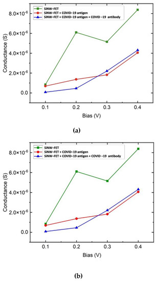 The presence of the spike protein can be detected as a function of the change in conductivity and current of the SiNW-FET biosensor. Th SiNW-FET sensor was tested for different types of viruses. The variation in the current was used to evaluate the sensor performance. The change in the current was calculated as the current for the sensor due to the placement of the target molecule minus the current of the bare sensor. The drop of the drain current of the SiNW-FET sensor after placing the target molecule was due to the negatively charged spike protein, which induced excess hole carriers. Figure 7a reveals that the bare SiNW-FET has higher conductance than the SiNW-FET + COVID-19 antigen or the SiNW-FET + COVID-19 antibody + COVID-19 antigen. The addition of the antigen or antigen and antibody together modifies the surface of the SiNW-FET resulting in a conductance reduction. The decrement in the SiNW-FET mobility occurred due to additional sources of dispersion of the charge carrier. This variation in conductance results in a unique signature due to the physical and chemical structures of the target molecule. The COVID-19 spike protein is negatively charged, which binds with the antibody resulting in a decrement in the conductance and current response. SiNW-FET shows a maximum conductivity at 0.2 V. Thereafter, the conductivity gets reduced. The reduction in conductance at 0.3 V is due to the negative differential resistance. Figure 7a shows the conductance while Figure 7b shows the current–voltage curves for the SiNW-FET at 0.1, 0.2, 0.3, and 0.4 V before and after placing the COVID-19 spike protein. The variation in current due to the COVID-19 placement on the biosensor channel indicates the successful detection of the COVID-19 virus. The adsorbed spike protein interacts with the SiNW-FET channel and modifies its conductivity by modifying the carrier’s concentration.