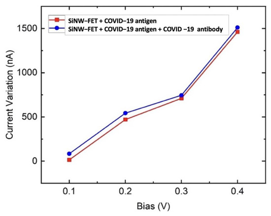 Figure 8 shows the variation of current at Vds = 0.1, 0.2 0.3, and 0.4 V at Vg = 1 V when the sensor was exposed to the COVID-19 spike protein. It is observed in Figure 7b that the current drops due to the placement of the COVID-19 spike protein. This variation of current is utilized to inspect the sensor performance. The current drop is due to the negatively charged spike protein, which induces excess hole carriers. Various studies have reported that the adsorption of the COVID-19 spike protein by the channel reduces the current since the holes concentration increases compared to the electrons [25,32,42]. Thus, the SiNW-FET electrical resistance increases due to holes trapping the electrons, leading to a current decrement. The difference in drain current (∆I) is larger when the bias voltage is increased. Figure 8 depicts that the ∆I increase is due to an increment of bias voltage. Moreover, Figure 8 shows that functionalizing the SiNW-FET channel with the COVID-19 antibody results in a higher variation in current and a higher sensitivity to the COVID-19 spike protein.