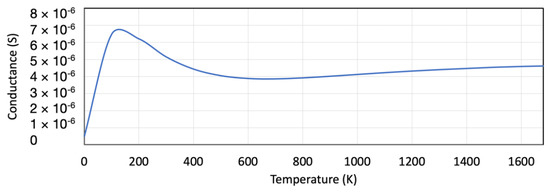 The field-effect transistor’s temperature-dependent conductance displayed in Figure 9 shows an initial decrease in conductance as a function of temperature. The conductance increases at the Fermi level due to the electron tunneling. At higher temperatures, the conductance increment starts stabilizing. Figure 9 shows that at 300 K and higher, the FET conductance is stable.