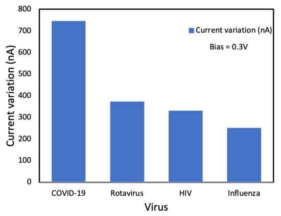The SiNW-FET was tested against other viruses such as influenza, rotavirus and HIV to analyze its selectivity. The sensor’s response (variation in current) is displayed in Figure 10. The highest change in electrical signal was when the sensor was exposed to COVID-19. These results demonstrate a high selectivity for the SiNW-FET to COVID-19. The electrical potential and charge changes at the SiNW-FET surface are due to their binding or adsorption of charged target molecule, which alters the density of charge carriers in the channel. Thus, the channel current and conductivity among the source and drain change [7].