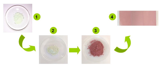 Step 1. WO3 powder was obtained from a precursor composed of tungsten hexachloride (99.8%, WCl6, AcrosOrganics, Gell, Germany) dissolved in a mixed solvent of absolute ethanol (100%, C2H6O, Sigma Aldrich, Munich, Germany) and 2-propanol (100%, C3H8O, Sigma Aldrich, Munich, Germany). The precursor was magnetically stirred at 140 rpm for 240 min in the dark until a yellow homogeneous solution formed. Gel development took place after the drop-by-drop addition of 0.24 mol sodium hydroxide (99.98%, NaOH, Honeywell, Charlotte, NC, USA). The gel was kept in the dark for 12 h and the final precipitate was centrifuged. The yellow powder (Figure 1, step1) was thermally treated at 410 °C for 4 h.