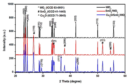 The crystalline composition of each sample was evaluated by X-ray diffraction, and the results are presented in Figure 2. All the analyses were done on films obtained from the same quantity of precursor without additional thermal treatment. The monocomponent sample contained WO3 with a monoclinic structure (ICCD 83-0951). The bicomponent sample contained monoclinic WO3 and tetragonal SnO2 (ICCD 41-1445). After the last synthesis step, the heterostructure exhibits all three metal oxides components: monoclinic WO3, tetragonal SnO2, and cubic Cu2O (ICCD 71-3645). The synthesis procedure allows WO3 and SnO2 to act as nucleation sites for the following component, which facilitates the formation of crystalline structure. There was no indication of mixed metal oxide formation, but the presence of amorphous compounds cannot be excluded [36,37]. Due to the synthesis procedure, no preferential orientation was observed. In order to avoid the formation of mixed copper oxides, the heterostructure powder was dried at room temperature for 12 h and the films deposited at 45 °C. Without annealing treatment, the persistence of carbonaceous species originating from the sol–gel synthesis is possible and may influence the photocatalytic activity.