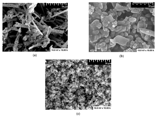 Sample morphology was evaluated by SEM analysis, and the results are presented in Figure 3. The monocomponent sample exhibits fiber-like morphology (Figure 3a) corresponding to WO3, which serves as substrate for SnO2 development. The fibers have a random distribution in terms of diameter and length. The addition of the second component (SnO2) will completely cover the WO3 fibers and the morphology resembles overlapping pallets (Figure 3b). The final heterostructure containing all three components presents a porous morphology (Figure 3c), with Cu2O uniformly distributed on the sample surface. Due to the low surface conductivity and the presence of aggregates, it was difficult to properly evaluate the grain size corresponding to the Cu2O/SnO2/WO3 sample. The WO3 and SnO2 provide preferential nucleation sites for the following component and preserve a close interface contact between the components [41].