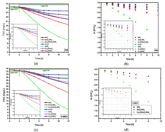 TOC, TN (inset), and the corresponding kinetics toward PIR (a,b), S-MCh (c,d), and MET (e,f).