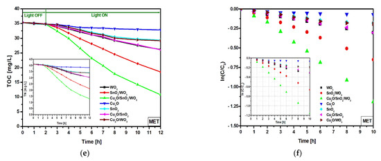 In order to differentiate the mineralization induced by the photogenerated oxidative species from the partial oxidation products, TOC and TN were investigated (Figure 5a,c,e), as well as the corresponding kinetics (Figure 5b,d,f and Table 3). The TOC measurements for PIR and S-MCh indicate small differences on the photocatalytic activity. The lowest TOC reduction was registered for bare Cu2O, followed by Cu2O/SnO2 and bare SnO2. The TOC reduction corresponding to the WO3 sample was 27.3% for PIR and 27.9% for S-MCh. Similarly, SnO2/WO3 (39.3% for PIR and 46.7% for S-MCh) and Cu2O/SnO2/WO3 (73.4% for PIR and 81.3% for S-MCh) recorded slightly TOC reduction efficiency, indicating that not all the carbon components were mineralized. However, the TN evaluation confirms the photocatalytic activity presented in Figure 4, meaning that the nitrogen removed during the irradiation was completely mineralized. An interesting finding was observed for MET pollutant, where both TOC and TN confirm that the photocatalytic removal efficiencies can be attributed to mineralization. It must be outlined that more work must be done to increase the photocatalytic efficiency above 86% for S-MCh, 80% for PIR, and 50% for MET in order to have a significant impact on the long-term effects. The mineralization mechanism of pesticides considers the following steps: (i) charge carriers’ development during the irradiation (Equation (4)); (ii) oxidative species (HO·) production during the reaction between the photogenerated holes and water molecules (Equation (5)); (iii) superoxidative species (·O2–) development during the reaction between photogenerated electrons and dissolved oxygen (Equation (6)), and (iv) interaction between the (super)oxidative species and pesticide molecules (Equation (7)).
