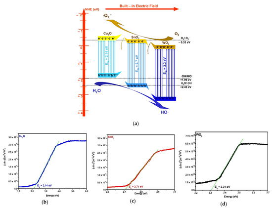 During the semiconductors’ interface development, the band gap may shift due to the internal energy field. The diagram corresponds to a Z-scheme charge transfer mechanism where the electrons generated during the light irradiation from the Cu2O conduction band (−0.35 eV) will transit the SnO2 conduction band on the way to the WO3 conduction band (+0.14 eV). The photogenerated electrons from SnO2 and WO3 conduction bands and the photogenerated holes from the Cu2O valence band (+1.79 eV) are not involved in oxidative species development, owing to their potential. In this case, some of the charge carriers will recombine. However, the useful photogenerated electrons from the Cu2O conduction band and the photogenerated holes from the SnO2 (+2.45 eV) and WO3 (3.44 eV) valence bands possess stronger redox ability and cannot recombine due to the electric field development in the charged separation region. The charge carrier’s mobility is sustained by the combined drift and diffusion effect. Consequently, the synergic effect provided by the heterostructure semiconductor components enhances the production of oxidative and superoxidative radicals responsible for pollutant mineralization. The heterostructure requires further improvement in order to reduce the charge recombination and to increase the overall photocatalytic efficiency toward pesticides.