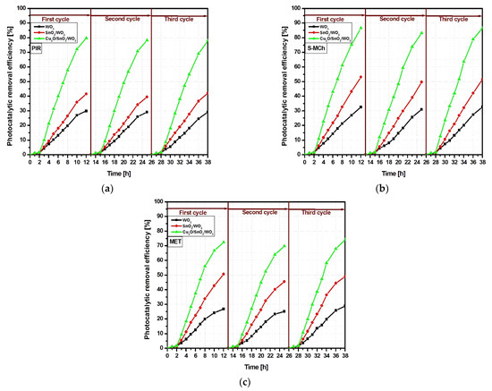 The lowest photocatalytic efficiencies (Figure 4a,c,e) correspond to bare Cu2O sample, which exhibit 10.5%, 11.7%, and 8.2% toward PIR, S-MCh, and MET, respectively. Similar photocatalytic activities were obtained for SnO2 and Cu2O/WO3, where coupling Cu2O with WO3 induced the presence of a high potential gap between the valence energy of Cu2O and that corresponding to WO3. The WO3 monocomponent sample was able to remove 29.8% of PIR, 32.5% of S-MCh, and 12% of MET. Due to this band-gap energy (3.31 eV), the WO3 photocatalyst used only a small fraction of the light radiation found at the border between UV and Vis spectra. When the second component is added, the coupled SnO2/WO3 benefits from the synergic effect of simultaneous charge carrier photogeneration in both semiconductors [49]. The photocatalytic removal efficiencies corresponding to SnO2/WO3 sample increase at 41.5% for PIR, 53.1% for S-MCh, and 26.8% for MET. The higher photocatalytic efficiencies correspond to the Cu2O/SnO2/WO3 heterostructure, which uses the extended UV and Vis spectra due to the Cu2O insertion with a band gap of 2.14 eV. In this case, the photocatalytic removal efficiency was 79.7% for PIR, 86.5% for S-MCh, and 50.6% for MET. The heterostructure photocatalytic removal efficiency is not a sum of the monocomponent sample efficiencies, as the contact between components induces a shift of the energy bands with consequences on the charge carrier’s mobility. The lower MET photocatalytic removal efficiency values compared with the other pesticides indicate that the oxidation process is influenced by the pollutant molecule structure and the chemistry compatibility with the photocatalyst surface [50].